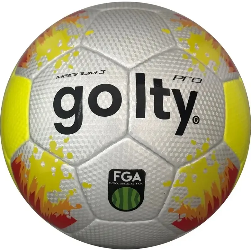 El Golty FGA Pro Magnum III es un balón de alto rendimiento enfocado en canchas de grama artificial. Cuenta con una estructura reforzada y construcción cosida a mano, lo que mejora la durabilidad y mantiene una excelente esfericidad durante el juego.