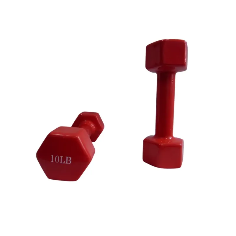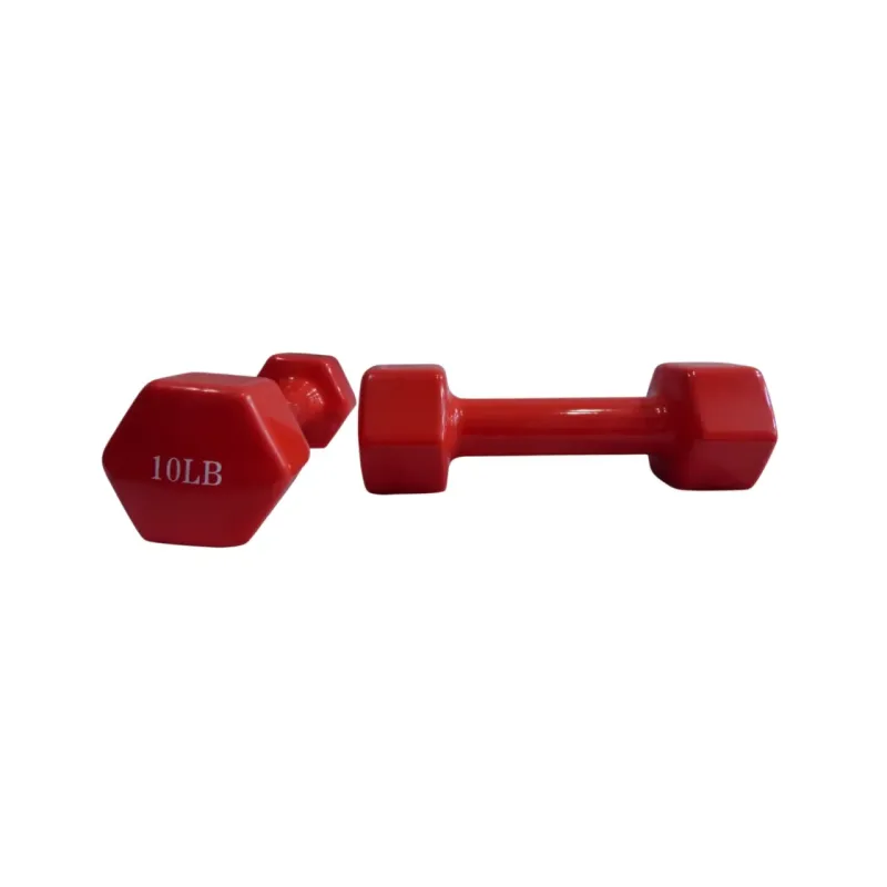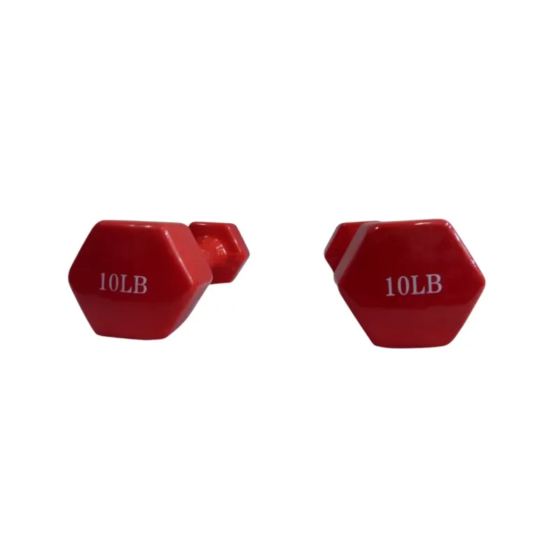 Mancuerna de 10 libras recubierta en vinilo, ideal para rutinas de entrenamiento en casa o gimnasio, proporcionando agarre cómodo y protección contra impactos.